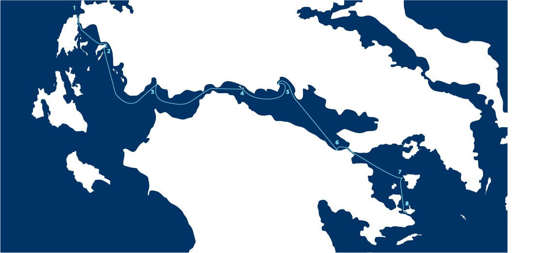 1. Lefkada 2. Kalamos 3. Mesolonghi 4. Trizonia 5. Galaxidhi 6. Corinto 7. Egina 8. Poros